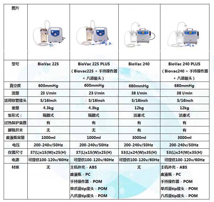 Biovac240細(xì)胞培養(yǎng)抽吸真空泵基本規(guī)格 (220V/50Hz):